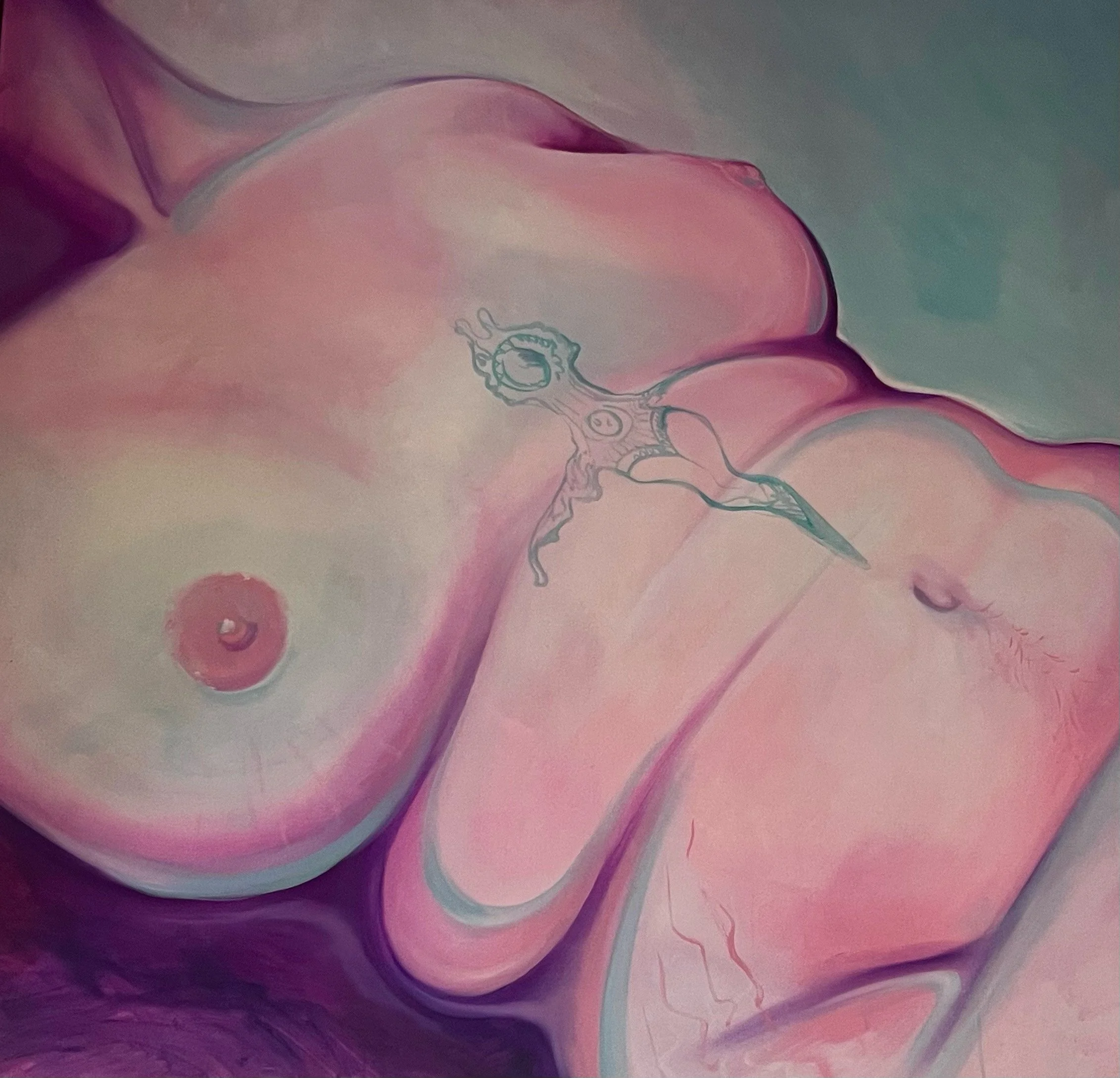 Modern Olympia references the iconic reclined nude pupular beginning in the 1500s, showing a contemporary and tattooed twist showcasing the stomach rolls and stretchmarks.
